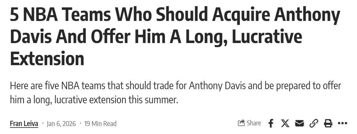 继名记Shams此前曝出独行侠计划交易浓眉哥,围绕弗拉格重新建队后,TA名记Sam Amick又在最新报道中指出,联盟内部数支球队消息人士透露,独行侠正在四处疯狂兜售浓眉哥。